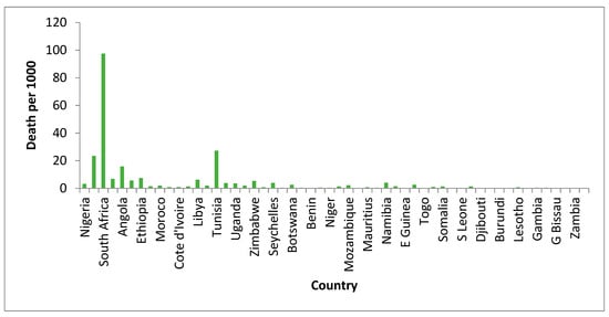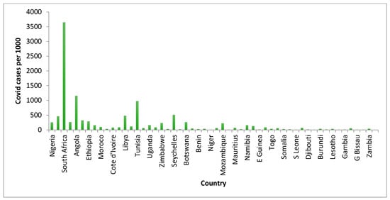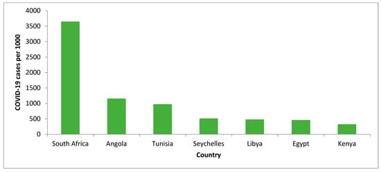 Figure 5 depicts the number of COVID-19 cases per 1000 people by country. It shows that South Africa experienced the highest number of cases (3648.968 per 1000 people), followed by Tunisia (974.214 per 1000 people).