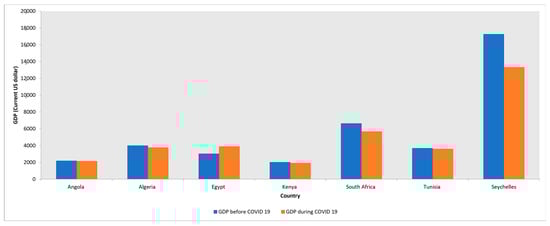 To examine the effect of COVID-19 on GDP per capita, the top seven African countries with high COVID-19 cases and deaths were taken into consideration. Figure 3 indicates the magnitude of GDP per capita before the pandemic (2019) and during the pandemic (2021), where the axis denotes the name of the countries (Angola, Algeria, Egypt, Kenya, Tunisia, South Africa, and Seychelles), and the axis indicates the GDP per capita in US dollars. It can be seen that the GDP per capita has decreased during the pandemic as compared to the GDP per capita before the outbreak of the pandemic in all countries except Egypt. The increase in Egypt’s GDP is largely accounted for by the fact that during the pandemic, a large amount of money was allocated to control and prevent COVID-19 and the government’s swift and prudent policy response, coupled with significant IMF support. Moreover, the country has experienced fewer movement restrictions and implemented a Preparedness and Response Plan (CPRP) (United Nations Egypt, 2020). The result based on the mean difference of the paired sample t test confirms a significant mean difference in GDP before and after the outbreak of the pandemic (Figure 3).