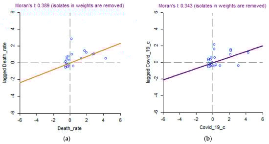 Based on the -values of the provided Moran’s I coefficients, the global tests of spatial autocorrelation suggest the rejection of the null hypothesis of no spatial autocorrelation of the two spatial components at the 5% level of significance. The Moran’s I coefficients of the confirmed cases and death rate show that the death rate due to COVID-19 and confirmed cases have substantial positive spatial autocorrelation or clustering. Under the assumption of normality, we utilize Moran’s scatter plot to depict global spatial autocorrelation, as shown in Figure 7a,b.