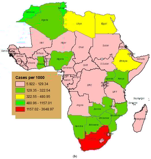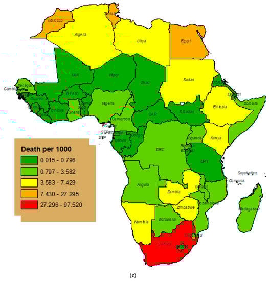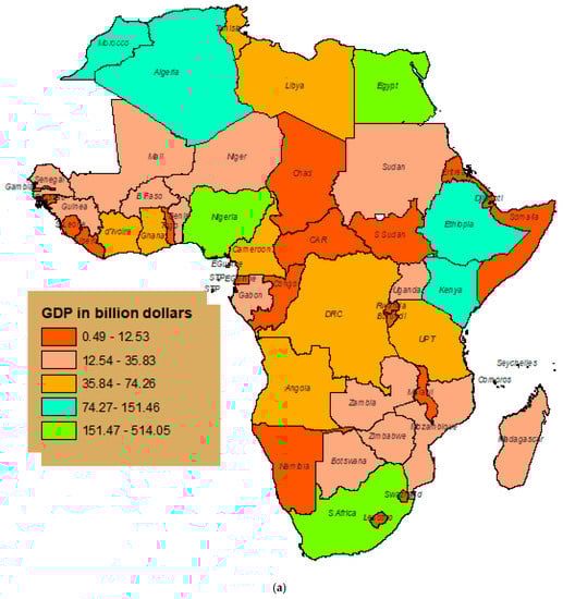 Figure 8a presents the spatial distribution of the percentage decrease in GDP per capita by comparing the values of GDP before and after the pandemic in African countries. It can be observed that in countries where there are fewer COVID-19 cases, the percentage decrease in GDP per capita in USD is low. On the contrary, in countries where there are high COVID-19 cases, the percentage decrease in GDP per capita in USD is high. Our results are similar to those of the study conducted by [38]. Following the result corresponding to the spatial distribution of GDP in Africa, the geospatial result corresponding to the COVID-19 cases and death rate in Africa is visualized in Figure 8b,c, from which we note that South Africa was the most highly affected country compared to the other African countries.