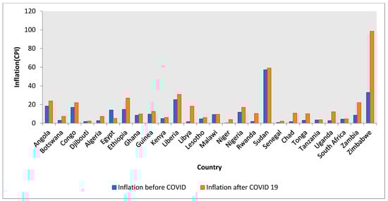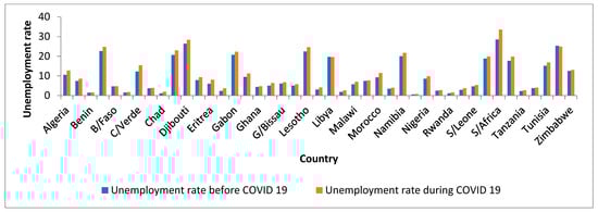This subsection addresses the level of inflation before and during the outbreak of COVID-19 in Africa. The study also explored the effect of COVID-19 on the unemployment rate based on the data taken from the employment and total labor force reports from the World Bank. Figure 9 shows the inflation after the outbreak of the pandemic as compared with the inflation before the outbreak of the pandemic in each country, from which we note that there has been a significant increment in inflation since the outbreak of the pandemic. We considered the consumer price index before the outbreak of the pandemic and the consumer price index of 2020 and 2021 during the pandemic for each country. As depicted in Figure 9, the inflation after the outbreak of COVID-19 for each country is high as compared to the inflation before the outbreak of the pandemic. The result reveals that there is a marked difference in inflation before and after the outbreak of the pandemic in all countries (Figure 9).