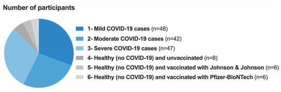 A convenience sampling method was used, and the 157 participants who gave consent were recruited to participate in this pilot study at the SBAH Complex (SBAH and Tshwane District Hospital) in Pretoria, SA. A total of 137 laboratory-confirmed COVID-19 patients, 12 vaccine recipients and 8 unvaccinated participants were enrolled between December 2021 and May 2022. During this time, the Omicron variant of SARS-CoV-2 was dominant in South Africa. A nasopharyngeal swab in RNA/DNA Shield reagent and blood in a serum tube were collected by a qualified phlebotomist registered with the Health Professions Council of South Africa (HPCSA) using standardized techniques. Good laboratory practice (GLP) procedures were followed to ensure accurate and reliable results. For the main analysis, the participants were categorized into 6 groups, namely Group 1: COVID-19 mild cases; Group 2: COVID-19 moderate cases; Group 3: COVID-19 severe cases; Group 4: healthy (non-COVID-19) and unvaccinated participants; Group 5: healthy (non-COVID-19) and vaccinated with the Ad26.COV2.S (Johnson & Johnson) COVID-19 vaccine; Group 6: healthy (non-COVID-19) and vaccinated with the BNT162b2 (Pfizer-BioNTech) COVID-19 vaccine. The COVID-19 severity classification defined by the Steve Biko Academic Hospital/Tshwane District Hospital was used and is illustrated in Supplementary Table S1.