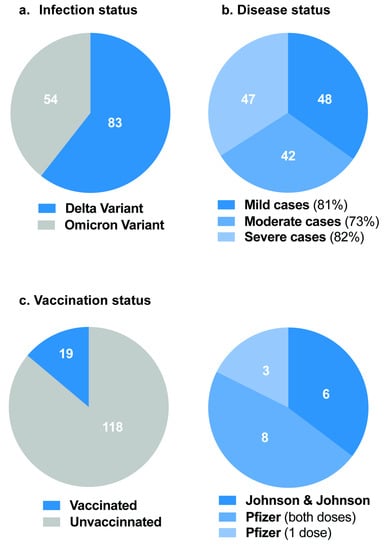 Of the 137 COVID-19 patients recruited for this study, 83 (60.6%) were infected with the Delta variant, whereas 54 (39.4%) were infected with the Omicron variant (Table 1). Out of the 137 samples, 19 (13.9%) were vaccinated individuals (Table 1), and the type of vaccine and distribution is shown in Figure 2.