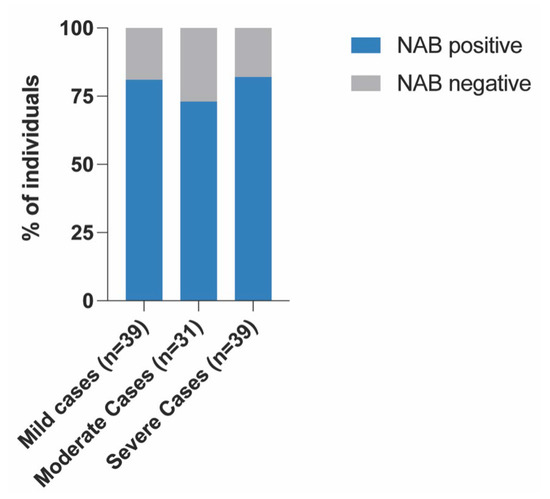 The production of SARS-CoV-2 NABs was observed in 81% of mild cases, 73% of moderate cases and 82% of severe cases (Figure 3).