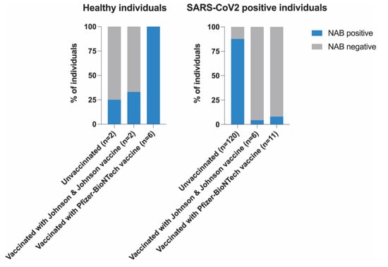 NABs were also observed in some healthy participants: 25% in unvaccinated participants, 33% in Johnson & Johnson vaccine recipients and all (100%) Pfizer-BioNTech vaccine recipients (Figure 4).