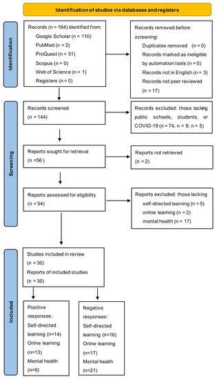 Nash, C. Scoping Review of Self-Directed Online Learning, Public School Students’ Mental Health, and COVID-19 in Noting Positive Psychosocial Outcomes with Self-Initiated Learning. COVID 2023, 3, 1187-1208. https://doi.org/10.3390/covid3080084
