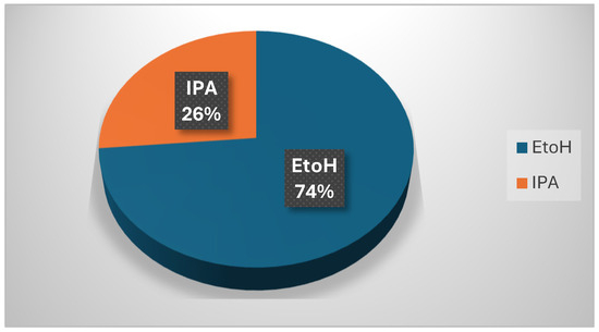 The research observed that ethanol was the most common alcohol present, constituting 74% (Figure 3) of the total alcohol content. Following ethanol, isopropanol was found to make up the remaining 26% of the alcohol content.