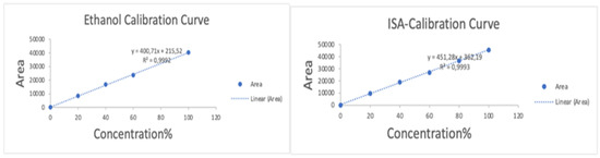 The external calibration curve for ethanol and isopropanol was created by diluting the stock solution with deionized water over a 0–100% range of ethanol and isopropanol. The standards were each placed in a 2 mL headspace vial, sealed, and thoroughly mixed using a vortex mixer. The criteria were promptly loaded onto the headspace autosampler tray for analysis and displaying six measurement graphs. In total, 1 mL of ethanol and 1 mL of isopropanol were combined and subsequently examined in order to evaluate the method. The ethanol or isopropanol external calibration curve was used to measure the alcohol content, as these are the two main alcohols suggested by the WHO for ABHRs. The calibration graph covered a range of 0% to 100% (v/v) and was plotted with alcohol concentration percentages (0, 20, 40, 60, 80, and 100%) versus GC peak areas (refer to Figure 5).