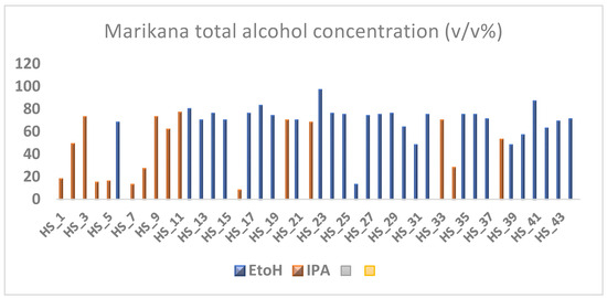 The findings of this study reveal significant concerns regarding the quality and compliance of alcohol-based hand sanitizers (ABHS) used in Cape Town’s informal settlements, particularly Kosovo, Masiphumelele, and Marikana. The non-compliance of 26% of the tested samples poses a direct threat to public health in these densely populated areas, where access to basic healthcare and hygiene products is limited. As displayed in Figure 11, the total alcohol concentration measured at the Kosovo informal settlement indicates the levels of ethanol and isopropyl alcohol present.
