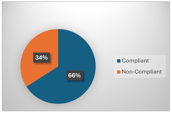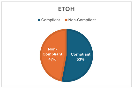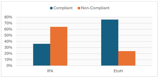 This figure shows the compliance rates specifically for ethanol and isopropanol-based hand sanitizers (Figure 10). It indicates that the majority of ethanol-based sanitizers were compliant with regulated concentrations, while a smaller proportion of isopropanol-based sanitizers met the requirements. This suggests that ethanol-based sanitizers were more consistently compliant with regulatory standards compared to isopropanol-based alternatives. The findings suggest that during the COVID-19 pandemic, local store owners in Marikana adhered to regulations and ensured that ethanol-based hand sanitizers, which are more prevalent in the area, were compliant with regulatory standards. However, attention should be given to the compliance of isopropanol-based sanitizers, as they play a significant role in hand hygiene practices and public health outcomes. It is important to note that hand hygiene compliance can be influenced by factors such as the visibility and accessibility of hand sanitizer dispensers, particularly at entrance points [35]. Therefore, efforts to improve the availability and visibility of hand sanitizer dispensers may further enhance hand hygiene practices in public spaces like spaza shops.