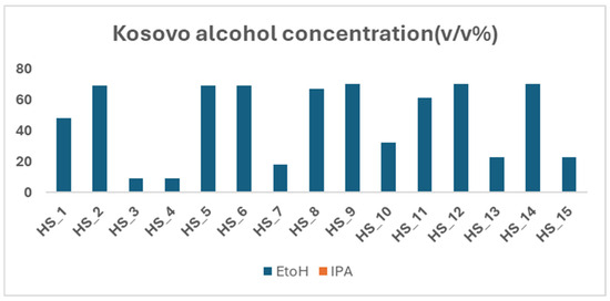 The analysis of hand sanitizer samples collected from Kosovo revealed concerning findings regarding ethanol concentration and compliance with regulatory standards. The analysis of all the collected samples revealed the presence of ethanol in each one. Furthermore, among the 15 sanitizers subjected to testing, 53% were found to exceed the recommended standard set by the World Health Organization (WHO) of 60–95%. Conversely, the remaining 47% fell below this standard (see Table 5). These findings are concerning as they indicate that the residents in the settlement may have had limited access to hand sanitizers with the effectiveness required to combat germs and viruses. This issue was particularly critical during the ongoing COVID-19 pandemic. It was found that the average ethanol content of all non-compliant samples was 47% by volume. Furthermore, the study revealed that the lowest observed ethanol content of any sample was 9%, as indicated in Table 5. Additionally, it was noted that no samples with isopropanol as the sole active ingredient were found on site.
