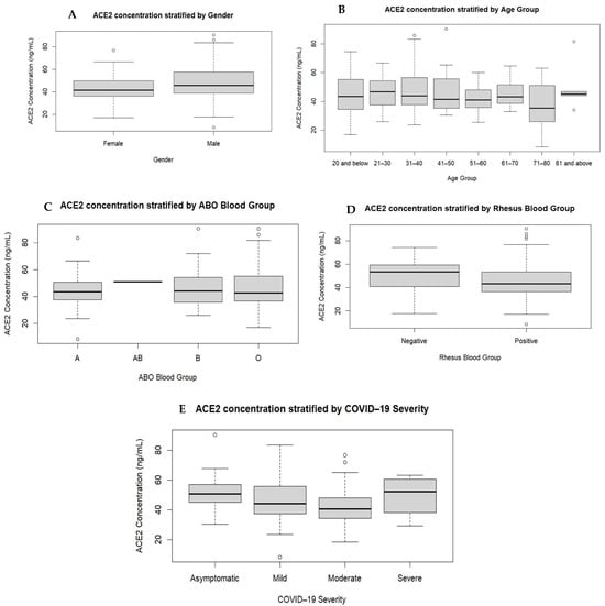 To determine the relationship between ACE2 levels and the severity of COVID-19 illness, gender, age or blood group, plasma levels of ACE2 were stratified by the aforementioned parameters. Comparing the median (IQR) among the participants based on the selected groups showed no variations in plasma ACE2 levels for age (p = 0.726), ABO blood type (p = 0.887) or Rhesus blood type (p = 0.073). However, plasma ACE2 levels were significantly (p = 0.032) higher in males (45.53 ng/mL, IQR = 38.61–57.59) than in females (41.43 ng/mL, IQR = 35.93–50.26). Although plasma ACE2 levels also significantly varied (p = 0.024) among participants based on COVID-19 severity, a Bonferroni post hoc analysis revealed that the significant variation (p = 0.015) lay only between those showing asymptomatic illness (50.61 ng/mL, IQR = 43.90–58.61) and those showing moderate illness (40.68 ng/mL, IQR = 34.09–48.10), and this latter group had the least concentration of plasma ACE2.