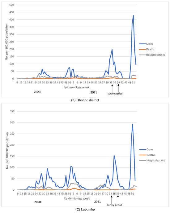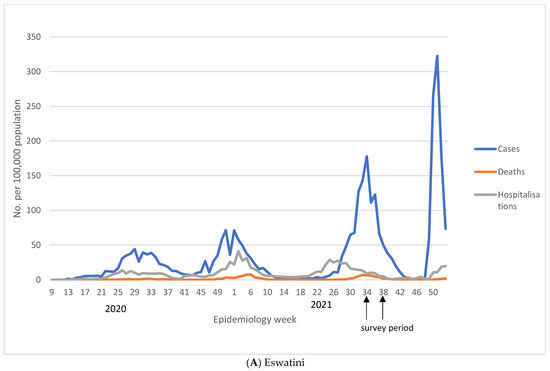 The following supporting information can be downloaded at https://www.mdpi.com/article/10.3390/covid4030021/s1: Table S1: Cumulative reported COVID-19 cases, hospitalizations and recorded deaths in Eswatini by region and COVID-19 wave.