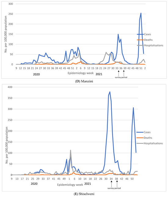 Reported COVID-19 cases, hospitalisations, and deaths in Eswatini at national (A) and regional (B–E) level. We show number of COVID-19 cases, deaths, and hospitalisations reported per week obtained from Eswatini Ministry of Health. Figure (A) reports national figures, whilst figures (B–E) represent regional numbers. For all regions, except for Shiselweni, each subsequent wave had higher number of cases compared to the previous wave. The fourth wave was associated with the lowest number of hospitalisations and deaths.