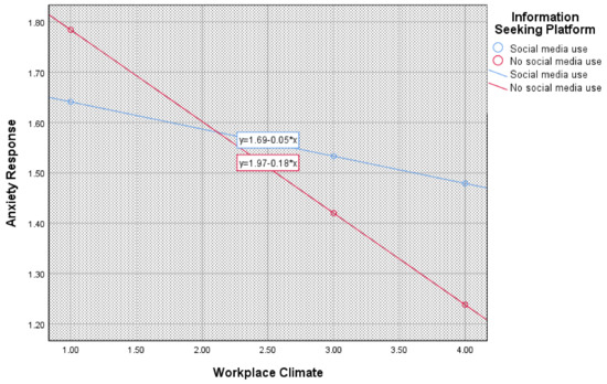 Moderating role of social media platform use (as an information source) in the relationship between workplace climate and anxiety response.