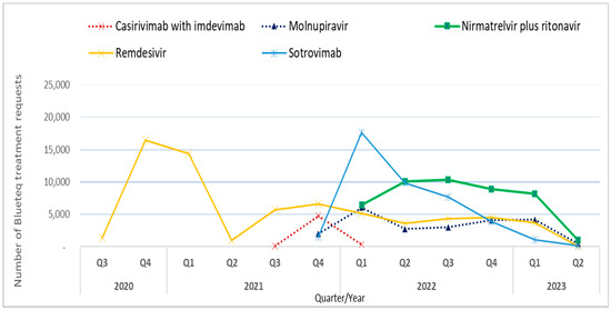 The highest numbers of treatment requests were in Quarter 1 and Quarter 2 2022 (n = 35,596; n = 26,332 treatments respectively). In 2022, there was a total of 108,786 treatment requests. Remdesivir was the most-prescribed treatment, constituting 36.8% (n = 66,946) of all requests. This was followed by nirmatrelvir plus ritonavir at 24.8% (n = 45,107), sotrovimab at 23.1% (n = 41,911), molnupiravir at 12.4% (n = 22,489), and casirivimab with imdevimab at 2.9% (n = 5221), the last of which was only used in England between Q3 2021 and Q1 2022 (Figure 1). Peaks in usage were seen in Q4 2020 for remdesivir (n = 16,484), in Q4 2021 for casirivimab with imdevimab (n = 4774), in both Q2 and Q3 2022 for nirmatrelvir plus ritonavir (n = 10,107 and n = 10,368, respectively), and in Q1 2022 for sotrovimab (n = 17,666), as indicated in Figure 1.