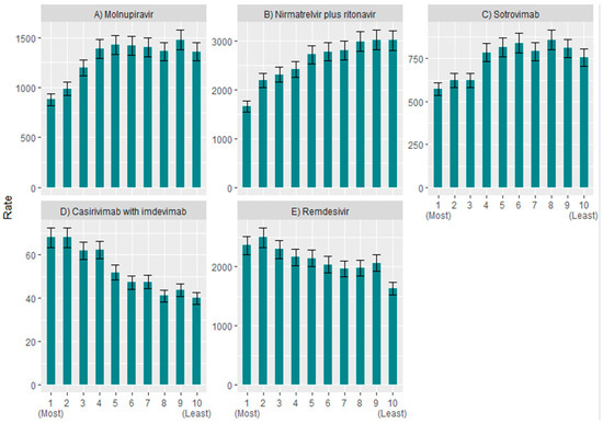 The rate of therapeutic use differed substantially according to IMD scores in England, and differentially according to the site of administration (Figure 2). The treatments primarily used in community settings—sotrovimab, molnupiravir, and nirmatrelvir plus ritonavir—displayed substantially lower usage rates in areas with higher deprivation compared to less deprived deciles. Conversely, remdesivir and casirivimab with imdevimab, predominantly used in hospital settings, demonstrated the opposite trend, and were requested at higher rates in more deprived areas. To illustrate, casirivimab with imdevimab had a higher rate of use in the first decile than in the least deprived decile areas (67.9; 39.9 per 100,000 COVID-19 cases, respectively). Similarly, remdesivir saw a higher usage rate in the most deprived decile compared to the least deprived decile (2359.3; 1633.6 per 100,000 COVID-19 cases, respectively).