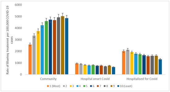 As seen in Figure 3, the rate of therapeutic use varied by IMD decile across different settings. Of the total treatment requests per 100,000 COVID-19 cases, 42,716.3 were made within the community setting; for patients hospitalised for COVID-19, there were 17,364.0 requests; and for hospital-onset COVID-19, 7871.4 requests were made. Rates of therapeutic use within the community setting were much lower in the most deprived areas than in the least deprived areas, with 53.3% higher rates in the least deprived decile than in the most deprived decile (4852.4; 2585.1 per 100,00 COVID-19 cases, respectively). However, within the hospital setting, there was a reverse trend, which indicates higher usage in the least deprived areas than in the most deprived areas. This accounts for a 67.1% difference between the most deprived and the least deprived areas (950.3; 637.7 per 100,000 COVID cases, respectively), while the rate of requests for individuals hospitalised for COVID-19 within the most deprived decile was 65.3% higher than that for patients within the least deprived decile (2008.9; 1311.6 per 100,000 COVID cases).