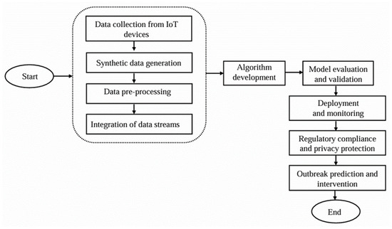 In aligning with medical and scientific standards to ensure the accuracy and reliability of COVID-19 detection, our approach leverages the integration of IoT (Internet of Things) data sources. IoT devices, which have become critical in healthcare for real-time data collection, provide extensive and diverse data pertinent to disease detection. Our study employed synthetic data to train and refine detection algorithms, ensuring they can effectively mimic real-world scenarios and account for various conditions. After collecting data from multiple IoT devices, this information was fed into our proposed system for COVID-19 detection. This system’s design and functionality are further elaborated in the following sections, with an overview provided in Figure 1. By incorporating synthetic data and real-time IoT inputs, we aimed to enhance the precision and responsiveness of COVID-19 detection algorithms, thereby contributing to more effective disease monitoring and control efforts.