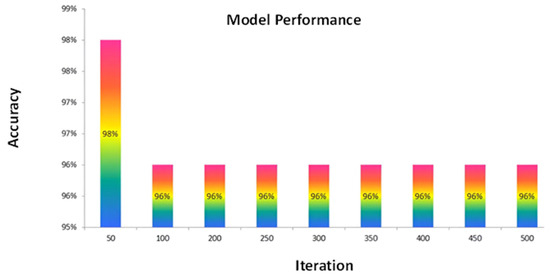 Upon scrutinizing the graph, it is evident that augmenting the number of iterations initially leads to an ascending trend in accuracy. The prediction skills of the model increase with increasing learning opportunities, which is consistent with the noted rise in accuracy. However, the graph also reveals a noteworthy turning point. Beyond a specific iteration count, the accuracy reaches a pinnacle and then gradually descends. This trend signifies that the model’s performance eventually plateaus, wherein additional iterations may lead to overfitting or erroneous generalization. Upon thoroughly examining the graph, it can be discerned that the highest accuracy, standing at an impressive 97%, is attained when the number of iterations reaches 50. Consequently, the model reaches its optimal predictive capacity after undergoing 50 iterations during the training process. This information is invaluable for determining the ideal learning rate and ensuring the model’s efficacy in predicting COVID-19 outbreaks in healthcare systems with enhanced accuracy and reliability.