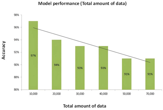 Figure 8 constitutes an illuminating graphical representation that delineates the correlation between accuracy and the dataset’s total number of data instances. The X-axis, aptly labeled as "total data number," signifies the size of the dataset in terms of the number of data instances it encompasses. Concurrently, the Y-axis, denoted as "accuracy," elegantly portrays the testing accuracy of the model. The observation that the total number of data instances present in the dataset profoundly influences the model’s accuracy is of paramount significance. The size of the dataset is an instrumental factor in determining the model’s predictive performance. It is worth noting that an exceedingly small dataset might impede the model’s ability to capture underlying patterns, thus leading to effective suboptimal accuracy. Conversely, as the number of data instances in the dataset expands, the model’s accuracy typically experiences an upward trajectory. This trend aligns with the general expectation that increased data availability facilitates a more comprehensive learning process for the model, consequently enhancing its predictive capability. However, intriguingly, the outcomes of this specific analysis reveal an exciting divergence from the expected trend. In this case, increasing the total number of data instances reduces accuracy. Notably, the model attains its peak accuracy of 97% when trained on a dataset containing precisely 10,000 data instances. This observation suggests an optimal balance between dataset size and the model’s capacity to generalize patterns. Interestingly, deviations from this optimal dataset size, either with more or fewer instances, result in diminished accuracy. As the number of instances in the dataset increases beyond 10,000, the accuracy decreases, which may be an indication of overfitting or noise amplification. Conversely, with fewer than 10,000 instances, the model may struggle to discern underlying patterns effectively, leading to decreased predictive performance. This analysis underscores the critical role of dataset size optimization in achieving maximal model accuracy, emphasizing the intricate interplay between data volume and predictive capability.
