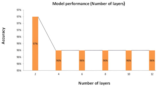 Figure 9 offers a comprehensive graphical portrayal of the attained accuracy concerning the variation in the number of layers implemented within our model. The X-axis adeptly designates the number of layers integrated into the model architecture, while the Y-axis indicates the corresponding testing accuracy. According to the initial setup, our model consisted of two layers, which were adequate to meet the needs of the work. However, a noteworthy observation emerged upon exploring the impact of increasing the number of layers beyond the optimal level. Elevating the number of layers beyond the model’s actual necessity resulted in a decline in validation accuracy. This empirical finding underscores the critical significance of striking an appropriate balance in the complexity of the model’s architecture. In spite of the fact that a certain amount of architectural depth is advantageous for the purpose of collecting intricate patterns within the data, excessive layering can give rise to harmful impacts on the performance of the model, which ultimately results in a reduction in accuracy. A prominent highlight of the graph is the realization that the model reaches its peak accuracy of 97% when the number of layers is at its minimum, specifically at two layers. This observation reinforces that judiciously selecting the correct number of layers is pivotal in optimizing the model’s predictive capability and avoiding unnecessary computational complexity.
