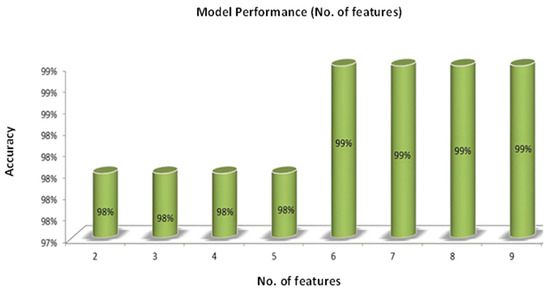 This upward trend exemplifies the beneficial effect of enriched input data on the model’s performance. In an outstanding turn of events, the maximal accuracy, which reaches an astounding 93%, is recorded when the number of characteristics hits its highest point, which is ‘9’. This outcome signifies the optimal balance between information richness and model complexity. Beyond this point, a further increase in the number of features may result in diminishing returns or even overfitting, potentially hampering the model’s ability to generalize to new data. The observations in Figure 11 resonate with the notion that enhancing model efficiency can be achieved by strategically increasing the number of inputs. This strategic augmentation ensures that the model effectively captures pertinent patterns and relevant insights from the data, ultimately bolstering its accuracy and reliability.
