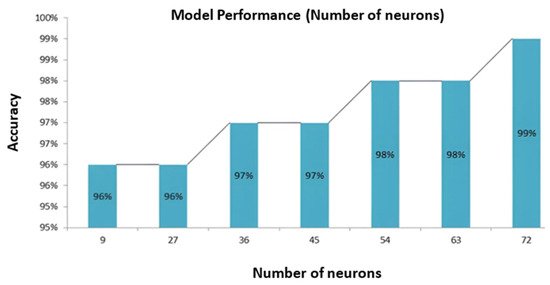 Remarkably, a neuron in this context represents a single computational unit involved in information processing and feature extraction within the model’s hidden layers. A compelling pattern emerges as we delve into the observations made in Figure 11. The graph unequivocally demonstrates that augmenting the total number of neurons within the model yields a pronounced impact on accuracy. As the model’s neural complexity increases, so does its capacity to discern intricate patterns and relationships within the data. This augmentation in neural capacity contributes to heightened model efficiency, culminating in improved accuracy. The graph reveals a remarkable outcome when the X-label value peaks at 72 neurons. Correspondingly, the Y label value concurrently reaches its highest position at an astounding 99%. This notable finding underscores the significant influence of neuron count on the model’s predictive prowess, wherein increasing the total number of neurons corresponds to a noteworthy boost in accuracy. However, it is imperative to exercise prudence in determining the number of neurons, as excessively high values may result in overfitting and hindered generalization to unseen data. Optimal neuron selection is pivotal to strike a delicate balance between model complexity and performance.