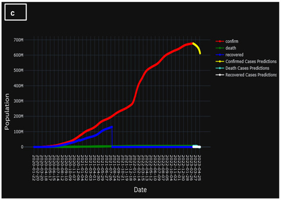 A clear and concise explanation of the temporal progression of the learning trajectory of the model is provided in Figure 12. Here, Figure 12a presents the actual population of confirmed cases, cases of death, and recovered cases, whereas Figure 12b represents the predicted population of confirmed cases, cased of death, and recovered cases. However, Figure 12c presents the comparison of the two historic and predicted scenarios. A brief decline in Figure 12c could indicate that, when the underlying system evolves over time, a model’s parameters may stray from its ideal values. Unexpected differences between expected and actual results may arise if these changes are not taken into consideration by the model. Evidently, during the initial training phases, discernible temporal patterns emerge wherein the model gradually acquaints itself with the intricate nuances inherent in the dataset. This early stage is marked by a considerable gestation period during which the model tries to understand the underlying complexity buried in the data.
