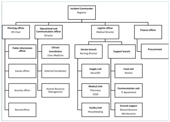 Incidental Command System (ICS) is officially defined as a “standardized approach to the command, control, and coordination of on-scene incident management that provides a common hierarchy within which personnel from multiple organizations can be effective” [14]. This system is essentially a vertical command-forwarding structure, which provides operational information and commands from top to bottom as the hierarchy stands. ICSs are designed to organize responses to crisis situations and disease outbreaks (for example, SARS in Taiwan, H1N1 in Mexico) [15,16]. To give an example of the visual structure of this system, we shortly discuss the implementation of a Hospital Incidental Command System (HICS) from a hospital in Nepal (Figure 3).