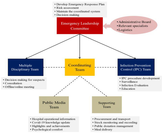 Zhongda Hospital, Southeast University [20], is an academic and comprehensive regional medical center in Nanjing, Jiangsu Province, China. It is equipped with 2000 beds. As can be seen in Figure 4, the institution established an Emergency Leadership Committee (ELC), created and oversaw their response plan, and also made strategic decisions. Below the ELC in the hierarchical branch, other coordinating and healthcare professional teams cooperated to tackle operative difficulties.