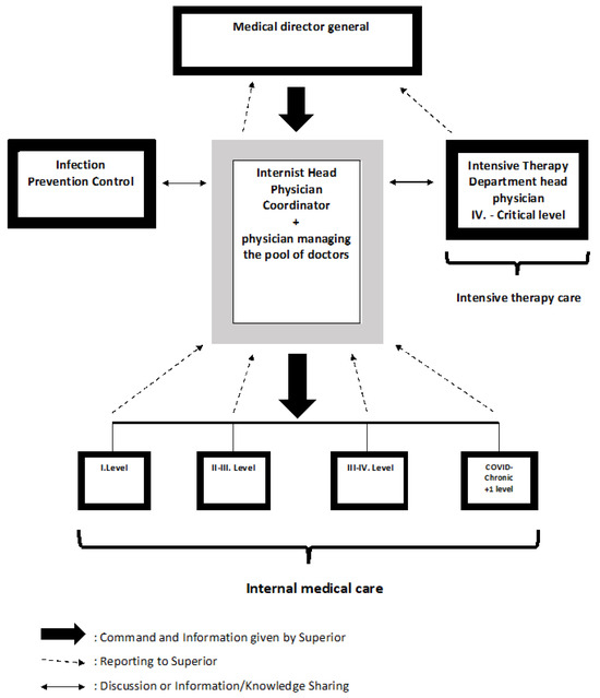 The basic idea was to build the central control vertically, where we could transmit commands in one direction and the reporting system could go the other way. With this hierarchically organized communication structure, we intended to ensure effective execution, precise control, and to minimize information loss. As can be seen in Figure 5, the trunk of the organizational system is formed by the positions of the medical director general and Internist Head Physician Coordinator (IHCP). Under the direction of the leadership group were the heads of COVID-19 patient care sites, based on the 4+1 levels idea mentioned earlier. To complement the group laterally, Infection Prevention Control (IPC) and the Head Physician of the Intensive Therapy Department were also supporting the centralized decision making.