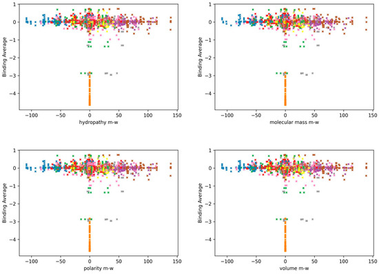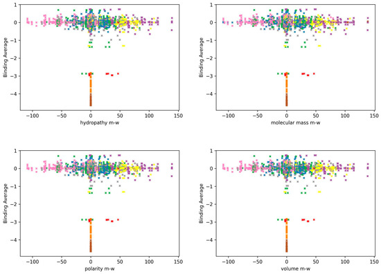 Analysis results of K-means clustering algorithm and K = 10 parameters to examine the binding effects of 4 different amino acid properties. Each graph has the bond strength on the y-axis (the higher the better) and on the x-axis from left to right: hydropathy, molecular weight, polarity, and volume, respectively. Data distributions are colored according to different groups.