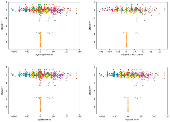 Analysis results of the K-means clustering algorithm and the K = 10 parameters to examine the effects of 4 different amino acid properties on the stability of the S-protein. Each graph has the bond strength on the y-axis (the higher the better) and on the x-axis from left to right: hydropathy, molecular weight, polarity, and volume, respectively. Data distributions are colored according to different groups.