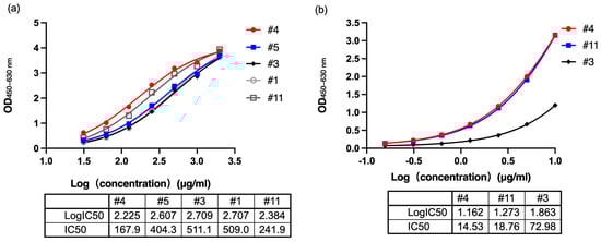 The antigen content determined by ELISA. (a) The IC50 between virus strains 1, 3, 4, 5, and 11 and homemade multiclonal antibody; (b) the IC50 between virus strains 3, 4, and 11 and Omicron-specific monoclonal antibody.
