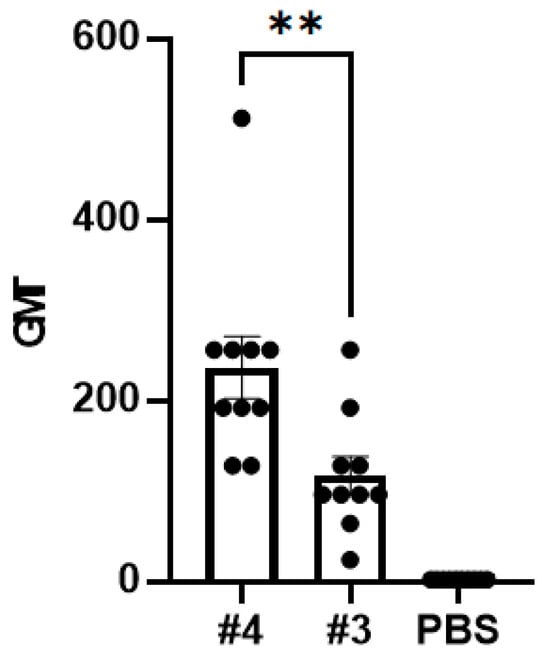 The results (Figure 4) showed that the neutralization geometric mean titer (GMT) (virus strain 4) against Omicron was about 219, while the neutralization geometric mean titer (GMT) (virus strain 3) against Omicron was about 100. This indicates that this virus strain 4 could induce a significantly higher neutralizing antibody titer than virus strain 3 (p value = 0.0038), which is consistent with the previous results.