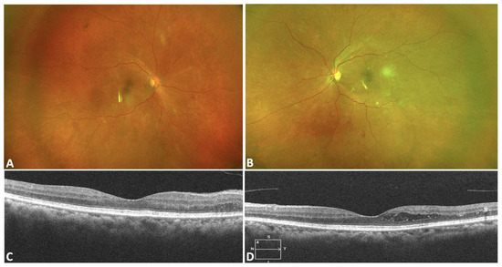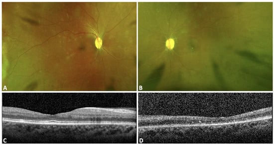 Fundus photos of patient 2 at 8 weeks follow-up show near complete resolution of retinal hemorrhage in the right eye (A) and reduced retinal hemorrhage and cotton wool spots in the left (B). Optical coherence tomography shows mild nasal macular edema in the right eye (C) and slightly improved cystoid macular edema temporally in the left (D).