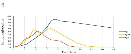 Kinetics of anti-SARS-CoV-2 immunoglobulins G (IgG), A (IgA), and M (IgM) [13,18].