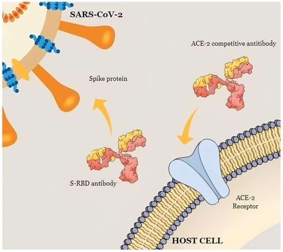 Several studies reported that S-RBD Abs binds with high affinity to the ACE-2 receptor, completely preventing virus–host cell interaction. Other studies investigating the performance of monoclonal antibodies (mAbs) described the neutralization power of these Abs, which could have therapeutic applications [27,34].
