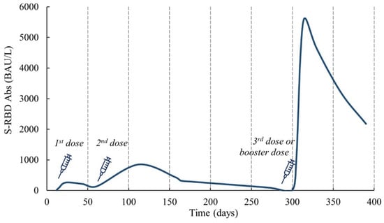 Figure 3 shows the typical antibody trend for heterologous vaccination, where a Pfizer-BioNTech dose was administered as the third or booster dose after the first two doses of ChAdOx1 nCoV19 [39]. Likewise, several studies have shown that mixing the ChAdOx1 nCoV19 and Pfizer-BioNTech vaccines triggers an immune response like or even more significant than two doses of either vaccine. The mixing of vaccines from different platforms can result in higher IgG and neutralizing Abs levels as well as a stronger cellular immune response; the use of heterologous COVID-19 vaccines has resulted in higher neutralizing antibody levels against Variants of Concern (VOCs) compared to homologous vaccines [66].