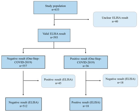 In this study, 633 serum samples were collected from various individuals. However, 40 samples, representing 6.3% of the total, were excluded from the analysis due to ambiguous ELISA results. Consequently, 593 serum samples were subjected to two anti-SARS-CoV-2 serological tests, namely the One-Step-COVID-2019-Test and ELISA (Figure 1).