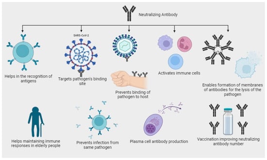 Neutralizing antibodies have been used as therapeutic agents to treat COVID-19 patients, either by isolating antibodies from convalescent individuals or by generating them through monoclonal antibody therapies [15]. Neutralizing antibodies contribute to the immune response through targeting the pathogen, as neutralizing antibodies are highly specialized proteins which binds to the antigen. For example, in the case of SARS-CoV-2, the spike protein on the virus’s surface is a primary target for neutralizing antibodies. By binding to these antigens, neutralizing antibodies directly recognize and tag the virus for destruction [16]; they can also neutralize the infectivity of the virus by binding to viral antigens and preventing their attachment and entry into the host cells, they recruit other immune cells, such as macrophages and natural killer (NK) cells, through a process called antibody-dependent cellular cytotoxicity (ADCC), and they activate complementary system leading to the formation of membrane attack complexes which punctures the viral membrane, causing the virus to lyse or rupture [17] (Figure 1). Neutralizing antibodies that are responsible for controlling infections are mentioned in Table 1. Vaccination strategies leverage this immune response by priming the body to generate neutralizing antibodies without causing severe illness. This proactive approach helps in the establishment of immunity from the virus, protecting vulnerable populations, and ultimately reducing the impact of infectious diseases like COVID-19. As research continues, a deeper understanding of neutralizing antibodies’ dynamics and interactions with different pathogens will aid in developing more effective vaccines and treatments for various viral infections [18]. However, it is essential to understand that the neutralizing antibody response to SARS-CoV-2 can vary between individuals and may decline over time. Factors such as the severity of the infection, age, underlying health conditions, and the emergence of viral variants can influence the level and potency of neutralizing antibodies [13].