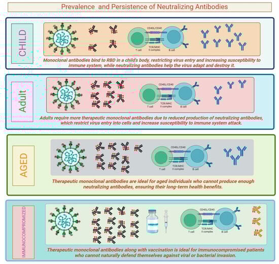 The prevalence and persistence of neutralizing antibodies can vary depending on several factors, including the pathogen, the individual’s immune response, and the duration of follow-up. In the case of viral infections, including SARS-CoV-2, neutralizing antibodies are typically detectable after an individual has been infected or vaccinated. The prevalence of neutralizing antibodies can be high during the acute phase of the infection or shortly after vaccination. However, the levels of these antibodies may decline over time. Studies have shown that neutralizing antibodies against SARS-CoV-2 can persist for several months, providing some level of protection against reinfection. Vaccination plays a crucial role in inducing neutralizing antibodies. In case of many viral vaccines, including measles, mumps, and rubella (MMR) and hepatitis B vaccines, neutralizing antibodies can persist for years and even decades, providing long-lasting protection against the respective infections [25], antibodies can also be generated in response to bacterial infections. For example, tetanus and diphtheria vaccines induce the production of neutralizing antibodies against the toxins produced by these bacteria. The variation in the response of neutralizing antibodies in this case is because Clostridium tetani is a bacterial infection which produces stable toxins and does not itself undergo any frequent genetic changes, while SARS-CoV-2, a new coronavirus, can evade the immune response and undergoes genetic mutations over time. In immunocompromised individuals, the prevalence and persistence of neutralizing antibodies is affected. These individuals have a reduced ability to produce and maintain a robust immune response, leading to lower levels of neutralizing antibodies and potentially increased susceptibility to infections [26]. Prevalence and persistence of neutralizing antibodies can influence the risk of reinfection and the impact of viral variants. Studies have shown that individuals with higher levels of neutralizing antibodies are less likely to experience severe disease upon reinfection. However, the duration of protection provided by neutralizing antibodies may not be uniform for all infections (Figure 2). In some cases, waning levels of neutralizing antibodies over time may lead to a higher susceptibility to reinfection, particularly with new variants of the virus that might partially evade the immune response [27]. Some infections, such as influenza (flu), are caused by viruses that undergo frequent antigenic changes, leading to seasonal outbreaks. The prevalence and persistence of neutralizing antibodies against influenza viruses can vary between different strains and may not always confer complete protection. As a result, seasonal flu vaccines are updated regularly to match circulating strains and to stimulate the production of strain-specific neutralizing antibodies [28]. In chronic viral infections, such as HIV and hepatitis C, neutralizing antibodies may be generated but the virus can evade the immune response and persist in the body. These viruses have evolved mechanisms to evade neutralization by mutating their surface proteins, thus making it challenging to maintain the persistence of neutralizing antibody responses [29]. The timing of vaccination can influence the persistence of neutralizing antibodies. Some vaccines may require booster doses to maintain protective levels of neutralizing antibodies over an extended period. For example, tetanus and diphtheria vaccines requires booster shots after every ten years to ensure sustained protection [30]. Neutralizing antibodies can vary with age. In some cases, older individuals may experience reduced immune responses and a decline in neutralizing antibody production, which may affect the effectiveness of certain vaccines. It is essential to note that the prevalence and persistence of neutralizing antibodies are dynamic and may change over time. Immune responses can be influenced by various factors including age, health status, and the presence of coexisting medical conditions.