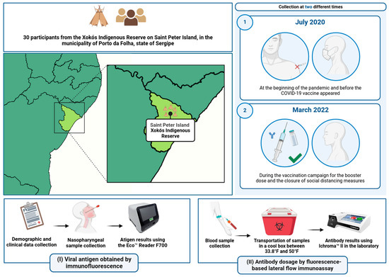 This study was approved by the Brazilian Ethics Committee (CAAE 31018520.0.0000.5546) and involved 30 participants from the Xokós ethnic group within the indigenous community of Porto da Folha, a municipality located 110 miles from Sergipe’s capital, Aracaju. The total population of the Xokós community is 375 individuals. All participants or their guardians provided consent for participation. Inclusion criteria required participants to be 18 years of age or older, free from immunosuppressive diseases, residents of the Xokós community, and members of the Xokós ethnic group. Initially, we gathered data on participants’ age, symptom presence, pre-existing comorbidities, and details regarding their vaccination history and schedule. Following the questionnaire, participants underwent serological testing and antigen screening. Data collection occurred at two distinct times: in July 2020, prior to the initiation of the COVID-19 vaccination campaign, and in March 2022, two months after the commencement of the booster dose campaign in the country. Figure 1 illustrates the methodology of our study.