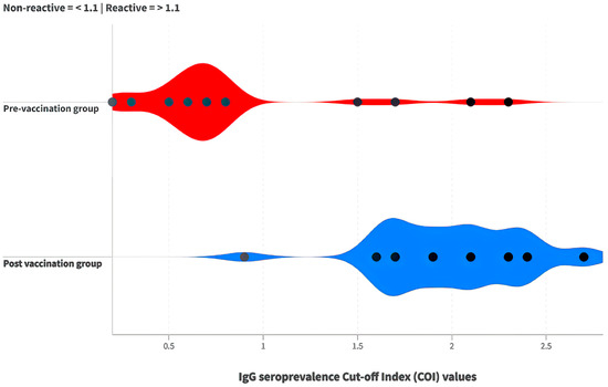 Comparison of cut-off index (COI) values for IgG antibodies between the pre-vaccination (red) and post-vaccination groups (blue).