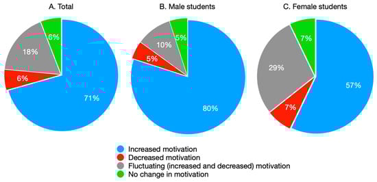 Of the 34 students who gave clear answers about their motivation status, about two-thirds (n = 23; 71%) attested to increased motivation, while only two said that their motivation had decreased. Seven students expressed having fluctuating (experiencing increased and decreased) motivation, and two experienced no change. Figure 1A–C shows the total results and compares them by sex. A higher percentage of male students (80%) reported increased motivation than female students (57%), while a larger percentage of female students (female = 29%, male 10%) reported experiencing fluctuating (increasing and decreasing) motivation to a degree that approached statistical significance (p = 0.107). This section may be divided by subheadings. It should provide a concise and precise description of the experimental results, their interpretation, and the experimental conclusions that can be drawn.