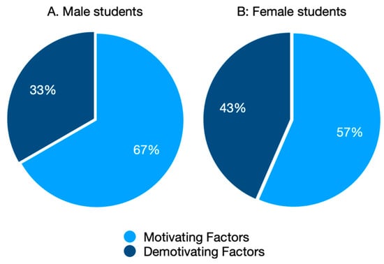 The consensus among the researchers who conducted the coding analysis of the 45 essays revealed 138 motivational statements and 83 demotivational statements, which were divided across 26 codes representing motivational factors and 11 codes representing demotivational factors. After discussion among the research group, the codes were then grouped thematically into eight motivational categories and three demotivational categories. Figure 2 shows the proportions (%) of motivational to demotivational statements comparing male and female students. The figure shows that female students had a larger proportion of demotivational statements than male students.