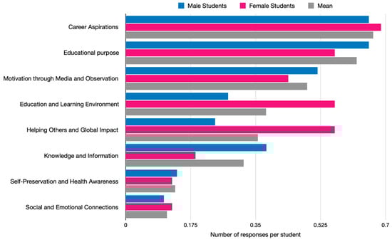 Figure 3 shows the proportion (shown as number of responses per student) of coded statements for each motivation category, with separate bars to represent the mean values and those for male and female students. Noteworthy differences between male and female students are the higher proportion of responses for male students in the Knowledge and Information category (male = 37.9%; female = 18.8%) and for female students in the Education and Learning Environment (male = 27.6%; female = 56.3%) and the Helping Others and Global Impact categories (male = 24.1%; female = 56.3%). With regard to the Knowledge and Information category, proportions of both codes within this category, Truth (male = 20.7%; female = 12.5%) and Scientific Interest (male = 12.2%; female = 6.3%) were substantially higher for male students. With regard to this category, the code Truth was used to represent statements where students describe how the pandemic made them more aware of the critical need for accurate information in medicine and public health and more conscious of the role they would play in ensuring the dissemination of reliable, evidence-based information. In this quest for truth, the code Scientific Interest describes how the pandemic sparked a newfound interest in specific areas of medical science, such as virology, immunology, and infection biology. Many students seem to have been inspired to explore these fields further, potentially influencing their future career paths.