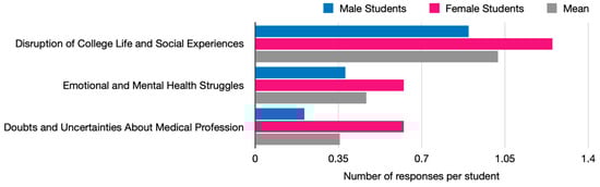 Figure 4 shows the proportion (shown as number of responses per student) of coded statements for each demotivation category, again with separate bars to represent the mean values and those for male and female students. Female students had a larger proportion of demotivational statements compared to male students across all three categories. The largest difference can be observed in the Doubts and Uncertainties About Medical Profession category (p = 0.062; male = 20.7%; female = 62.5%), with the code of Difficult Profession being particularly distinct and showing statistically significant difference between male and female students (p = 0.017; male = 6.9%; female = 37.5%). The code Difficult Profession represents statements in which the students described how the pandemic made them aware of the inherent risks and difficulties of being a healthcare worker. The realization that doctors and other healthcare professionals were facing life-threatening risks, working under extreme pressure, and sometimes facing public criticism led some students to question their ability to handle the demands of the profession, which appears to have introduced doubts and anxieties about their future careers. Within the category of Disruption of College Life and Social Experiences, which was high for both male and female students, the code of Experiments and Practicum was of a notably higher proportion for female students and showed a strong statistical difference (p = 0.006; male = 6.9%; female = 43.8%).