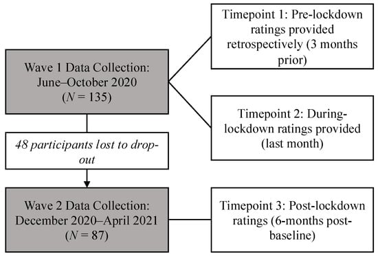 The study took place in Melbourne, Victoria, Australia’s second-largest state, which experienced an 18-week lockdown in 2020. During the strictest phase of the lockdown, lasting over 3 months, individuals were only allowed to exercise outside their homes for 1 h per day, and one household member could go out to purchase essential items. A curfew was in effect from 8pm to 5am, and travel was restricted to a 5 km radius from home. Visits from outside individuals were prohibited, including extended family and friends. Schools were closed, except for young people whose parents were essential workers or those who were unable to learn from home safely. Medical appointments were primarily conducted via telehealth. Playgrounds, cultural and recreation centers, face-to-face organized sports and recreation activities (e.g., music lessons, etc.) were either closed or moved online.